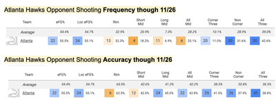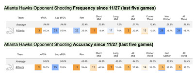 Hawks’ opponents have finally cooled off from the perimeter (32.6% opponent 3P% over the past five games) after shooting an incredulous 39.9% from three through the first 18 games of the season — and it’s not just a matter of them clanging open looks, either.