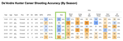 *Per CTG, Hunter has been assisted on 83% of his rim-FG’s this season, and increase from last season, when he was assisted on 76% of his rim-FG’s.